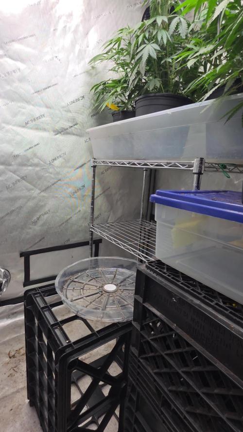 12/16 On 12/16 after harvesting apricots, I had to move Cadillac1 off the shelving unit and put her on lower crate. She is as tall as the other plants positioned on the top shelf. I topped Cadillac1 but since she is asymmetrical, I don’t think topping will create 2 tops. Time will tell.