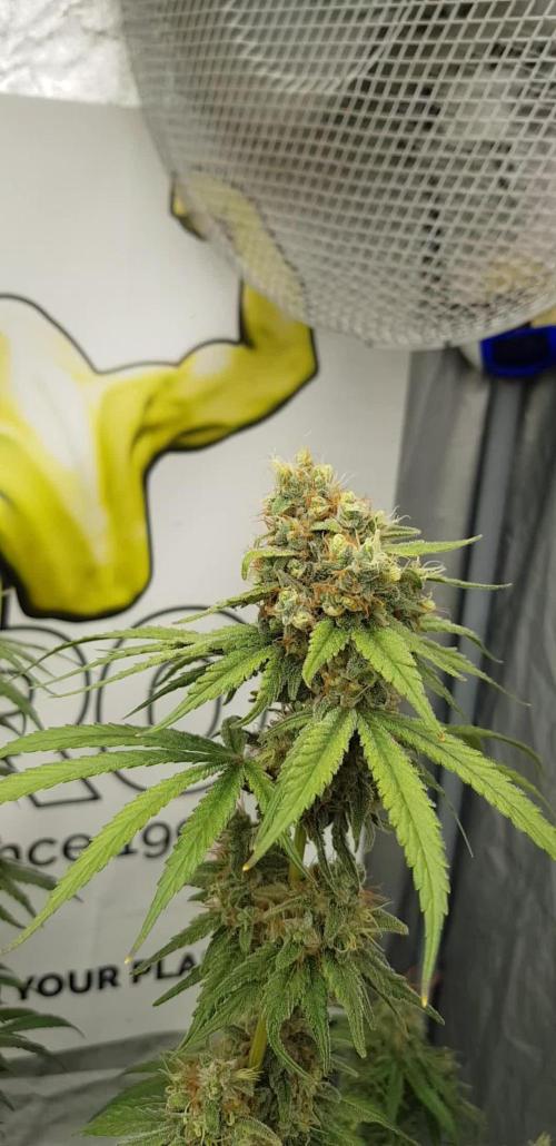 Frostbanger Plants 1-6 Week 8 May 18– 24 FLOWER 4 Nutrients : GH Micro 25 ml GH Gro 10 ml GH Bloom 30ml CalMag 30 ml Recharge 10ml Green sensation 16.5ml Power buds 7.5 ml 5/17 PH 6.3, PPM 1130, temp 71 1ltr each 5/18 PH 6.67, PPM 935, temp 68.5 1 ltr each 5/20 PH 6.67, PPM 1330, temp 68.5 2 ltr each 5/21 PH 6.66, PPM 984, temp 69 1 ltr each videos & pics 5/17 Defoliation of yellowing leaves, feed, pics As I mentioned last week, I must monitor and control the tent environment manually. For the past month, the humidifier has been an issue putting out way too much humidity; often leaving water in the bottom of the tent. In addition, the temperatures are also out of control. I added an AC last week to keep the temperature below 80. I finally determined the exhaust vent is also broken and has been for some time. AC Infinity does not extend the warranty to the replacement parts. I guess that makes sense since they would be in a state of perpetual free replacements. I bought a new one from Amazon that came with a new controller which is different from the controller 69 currently using. I decided that while it is very inconvenient and inefficient to monitor the tent through the day, I would rather finish this Frostbanger run without introducing a new unknown variable. I will continue using 3 circulating fans, the 4” exhaust vent from my 3x3. I have the AC pushing air in and the exhaust pulling air out. This creates a neutral pressure tent environment-neither positive nor negative. It looks like growth has stopped and plant height has been reached. Now is the time for buds to fatten and frost up. All 6 of them are short remaining less than 3 ft. They range from 15 to 31 inches. #4, 5 &6 are showing some fade, particularly #4. Upon opening the tent, a melon smell comes off the buds if I get close, and more stickiness was observed during the process of defoliation. They are living up to the new strain’s name. #5 is the frostiest followed by #2. Wow week 3 of flower and that much frost already. Before FastBuds announced the strain name and characteristics, I was disappointed that FBA2502 could be an indica sleepy strain but the universe provides what you need at the time. The new strain profile indicates a whopping 29%THC with mainly sativa uplifting, euphoric, social effects with sweet fruity flavors which I love and enjoy. In addition, I recently bought a dap press and this strain is frosty and resinous. She will be great to press for live rosin. FBA2502 is FROSTBANGER. Meet Frostbanger Auto, an autoflowering and Indica-leaning hybrid packing a staggeringly high THC content averaging 29%, making this one of the most potent strains on the market. It was created by Fast Buds through crossbreeding Gorilla Glue and Chemdawg, two equally iconic strains. Growers must know that these difficult-to-grow plants will pose specific challenges in terms of environmental control and nutrition, making them best suited for cultivators with some experience under their belt. The flowering cycle is short, averaging only 50 days, and yields are usually around 300g/m². The Frostbanger Auto flavor and aroma are both mouthwatering with a delightful combination of sweet, fruity, and flowery notes. The high is mainly Sativa-driven with uplifting and happiness-inducing effects that lead to euphoria and a general sense of well-being. You might feel sociable and talkative, but too spacey to say something. Following this surge of energy comes a deepening sense of relaxation, leaving you sedated and completely at ease with the world. Due to its potency and these long-lasting effects, medical patients hail Frostbanger Auto for treating chronic pain, stress, and even depression. Measurements: #1 15” #2 20” #3 17” #4 30” #5 31” #6 24” Your likes and comments are appreciated. Thanks for stopping by. Growers love 💚🌿 💫Natrona💫