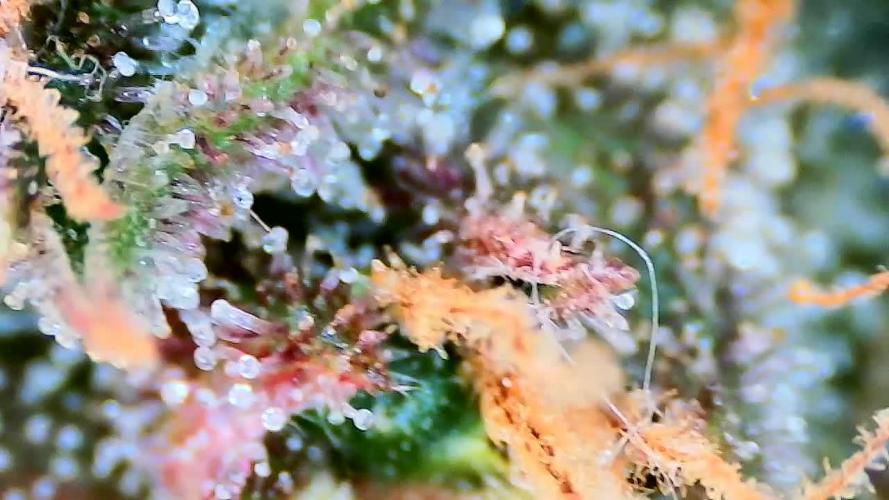 Lemon Cherry Cookies doesn't have as much, but she is certainly sticky and smelly. Maybe I can't see as much because the buds are darker and not as developed as her compadre.