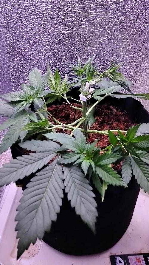 Day 24. She's feeling great, we're continuing with light LST. I slightly damaged one leaf, so I'll leave it as is. She's growing like crazy. I noticed a slight calcium deficiency, most likely dolomite dust, which hasn't started working yet, or perhaps the light was too intense. However, the average ppfd level is 600 at the top and 300 at the bottom. In total, I made a two-day aero tea for 10 liters of water: 200 grams of vermicompost, 1 teaspoon of ground nettle, 2 teaspoons of carob, 1 teaspoon of chlorella, and 1 teaspoon of ground moringa. Without diluting with water, I filtered 1 liter of the finished tea, added 0.5 Calm Ag, brought it to a pH of 6.5, and poured it out. The tea turned out to be 700 ppm. We'll continue to watch. I definitely like how this baby is growing.