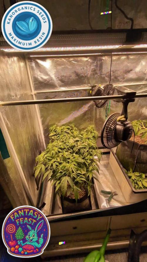 This two were part of another diary and got moved out due to space reasons at VW8 and moved back indoors at VW20 https://growdiaries.com/diaries/218151-auto-god-s-glue-grow-journal-by-yan402 13.09.25 VW21 Both are looking good and are developing tighter nodes than when they were outside, I'm going to have to keep cutting them back every once and a while I also applied nematodes against thrips and fungus gnats. 20.09.25 VW22 some spots and some yellow leafs, I think it's a root problem, probably root bound, but both seem healthy and are getting thicker so maybe just top up with Coco coir and give a slight different nutrient schedule less Tri Part Bloom could do the trick MAYBE lol. 🌱💦🌱💦🌱💦🌱💦🌱💦🌱 Day to day tasks & actions 🌿 🌱💦🌱💦🌱💦🌱💦🌱💦🌱 27.09.25 VW22 – Fed 3l of #1 → 2l runoff (*RUNOFF reused for tomato plants) 🍶💧🍶💧🍶💧🍶💧🍶 💧 Nutrients in 30L #1 🍶💧🍶💧🍶💧🍶💧🍶 💧 TriPart Micro: 10ml = 0.33ml/L 🍶 TriPart Grow: 0ml = 0.00ml/L 💧 TriPart Bloom: 10ml = 0.33ml/L 💧 Cal-Mag: 60ml = 2.00ml/L 🍶 Home-made FFJ/FPJ (new batch): 30ml = 1.00ml/L 💧 pH Down: Citric acid (BuxXtrade) — adjust to ~pH 6.0 📦 TOTAL: 120ml per 30L 🔬 4.00ml/L 🍶💧🍶💧🍶💧🍶💧🍶 ⚙️✂️⚙️✂️⚙️✂️⚙️✂️⚙️ ✂️ Tools & equipment ✂️ ⚙️✂️⚙️✂️⚙️✂️⚙️✂️⚙️ ✂️ 2× MarsHydro SP3000 ⚙️ MarsHydro 150mm ACF Ventilator ✂️ Trotec dehumidifier (big unit) ⚙️ Mini no-name dehumidifier ✂️ Kebab skewers (LST – stainless) ⚙️ Wire + roast skewers (LST assist) ✂️ Scissors (HST) ⚙️ Vacuum (for spills & cleanup) ✂️⚙️✂️⚙️✂️⚙️⚙️✂️⚙️✂️⚙️✂️⚙️ 🍒🍭🍬🌈🍒🍭🍬🌈🍒🍭🍬🌈🍒 🦄Fantasy Feast ( Seeds)🦄 🌈🍒🍭🍬🌈🍒🍭🍬🌈🍒🍭🍬🌈🍒 Species: Hybrid (Regular) Genetics: The mother is Unicorn Whip by Dirty Bird Genetics. The father is Charcuterie by Cannarado Genetics. Effect: Unknown Mixed effect body and head high Flavor: Some phenos are Skunky gassy fruity, some are fruity sour citrus with a chemical touch and a touch of skunk Flowering: Estimated 8–10 weeks Resistance: Strong — Testing phase done