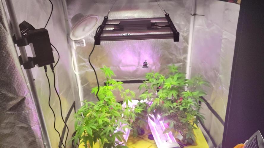 Overall, I'm very happy. The DinaMed CBD+ has taken the lead in the bud development category, Nice fat buds that are very dense. Sticky and stinky as hell too. She is supposed to be somewhere in the teens for CBD percentage and less than 1% THC. I'm hoping she either comes in below 0.3% or has well over 1%. I'm allowed to submit for testing 3 weeks before harvest. I'm going to cut a mid level branch and submit for testing next weekend.