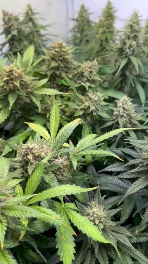This is the 8th week. Thursday will be 9 weeks of 12/12. Some trichs are amber. They just added a good bunch of girth over the past few days, but most of the pistils are red now. The rest of them have been dropping leaves consistenly but the canopy remains full so they must be putting out more leaves. I just flushed to 80% runoff and found out that I had 1200ppm. I just got an ec meter but my last reading said closer to 600 so idk what happened there. I flushed until I had runoff ppm of about 150. Now they're back in the grow tent. I don't want to keep assaulting them with my microscope. I think they're ready. Just gonna let them settle another day or two to dry out a bit. I took one small branch off the small Wedding Cake plant on Thursday and I've just been watching it dry on my counter. It's been 5 days and the stem snaps but still leaves a fiber connecting. I put it into a small jar with a 64RH thing. I just want to try it. It already smells amazing. The leaves on the big CBD Blue Shark plant are going really yellow and some other colours are starting to come out as well. The buds all fattened up and got more frosty again. I was worried they were foxtailing but they got more calyxes underneath the peaks and have been making more of a pyramid shape. They're really close to peak. Harvest day will be March 17 or 18. March 17 1023pm chopped and hung after lights off all day. RH was 65% before I chopped and 50% after I closed the window and cut the plants off the saturated pots. I did a wet trim to prevent mold. The buds are sticky af. Gonna hang them to dry for 7-9 days before curing in jars :) March 18 : checked the RH when I woke up and it's chilling at 45% 😎 March 19 : just checked to see how they were drying. There are seeds in every plant. RIP I'll update when I put them in jars and again a few weeks later for final review. Overall it was a good grow despite the rocky start and a good introduction to the mainline technique and my new grow space. Next grow I should have everything pretty well dialed in. March 23 They were hanging for 3 days. Rh was around 45, then spiked to 65 overnight when I forgot to turn the fans back on. Temp was high at around 26.they felt wet after 2 days, and bone dry after 4 days. The stems still didn't snap but I put them in jars anyway. A day later, jar RH was 50%. I burped all the jars and there was a smell from the new jars. I took all the weed out, washed out the jars, and did a dry trim on the weed. One of the Wedding Cake plants must have gone hermie. I didn't see any bananas and didn't even realize there were seeds until the very end. The seed pods looked just like calyxes while the plants were growing. Many of the nugs are unusable. Under the sugar leaves are just layers and layers of seeds. Some weren't hit that badly. The CBD Blue Shark is much better off but still has some seeds. I'm trying to stay positive. It's a bit of a shock though. I'm anxious to try the finished product. If the flowers at least taste good and have a good effect, all is not lost.