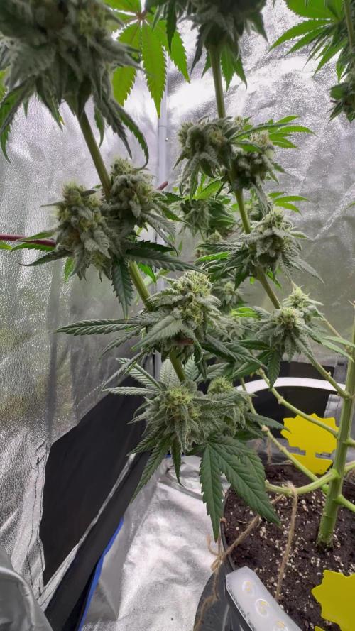 week 5 flowering - No herms, strong aroma, and THC production! 🌿🌸🌱🔥 Hello, fellow growers! It's time for another thrilling update on my flourishing journey. We've officially entered week 5 of the flowering phase, and things are looking absolutely fantastic. Here's what's been happening in my grow room: The most exciting news is that I haven't encountered any hermaphroditic plants thus far. It's a relief to see the ladies staying true to their gender and focusing solely on bud development. 🚫⚡️ The aroma emanating from the grow room is simply amazing! The fragrance has become more pronounced and enticing, filling the space with the delightful scent of resinous goodness. It's a testament to the terpene profiles of these strains. 🌿👃🌸 Additionally, the THC production is in full swing! The buds are swelling and becoming denser by the day. It's truly a sight to behold, and I can't wait to see how they'll develop further as we progress through the flowering stage. 🌿🌱🌸💪 While the plants are thriving, I've noticed a slight nutrient burn on the tips of some leaves. To address this, I've decided to dial back the nutrient concentration a bit for this week. It's important to maintain a careful balance and avoid overfeeding, especially during this critical phase. 💧💚 As for the nutrient solution, the pH has remained stable at 6.33, ensuring optimal nutrient uptake by the plants. The TDS (Total Dissolved Solids) level has been consistently maintained between 1150 and 1250, providing the plants with the necessary nutrient balance. ⚖️📈 With everything going so well, I'm filled with excitement for the upcoming week of flowering. Let's continue to nurture these beautiful plants and enjoy the bountiful rewards they will bring. Happy growing, lads! 🌿💚🌸😎