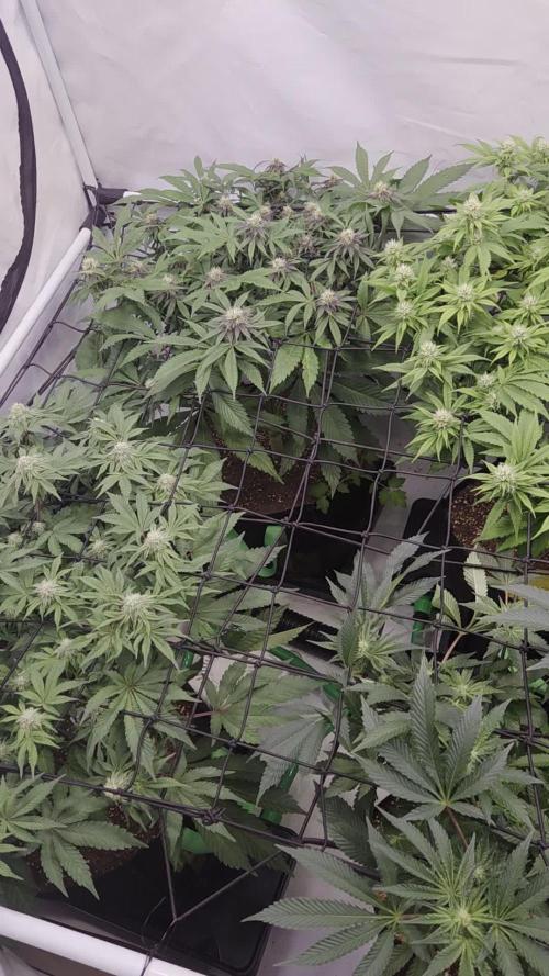 First week of flowering went good, had some trouble with my ph meter again, so I ordered a bunch of ph equipment and I’m gonna start fresh with everything new. Lol sick of second guessing my crappy pens. Plants are staying pretty compact so far, they have started to stretch a little bit but we have only done a few tucks on them. They are either gonna stay short or haven’t started there main stretch yet, but we are 10 days into flip so they should be stretching by now. Time will tell I guess. Lol I removed a few of the larger guard leaves up top to open up the middle of the plants more to the light. I have around 40000 lux at the top of the netting and they seem to be taking it fairly well. I’m yet to get my water chiller installed as I’ve been very busy this month and haven’t had time to finish my DIY video for it. Lol hopefully this week we will get it installed and get our water temps down a little lower. I got some more H2O2 coming soon too so can’t wait to get using that again, plants just haven’t been the same without it, but I haven’t been able to find it reasonably priced anywhere near me in a long time. I am using UC Roots now in its place to keep my res/water clean, but it’s not as good. H2O2 has extra oxygen on top of keeping things clean, so can’t wait! Well that’s it for this week, Cheers💨