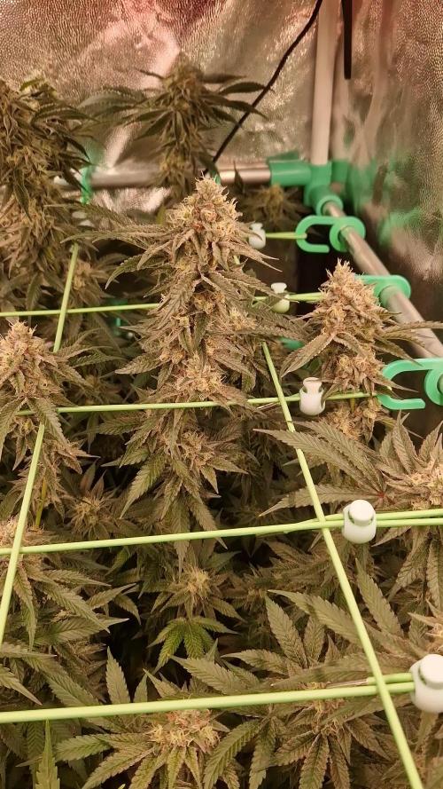 Today is the last day of the second week of this diary (6th week of growth), and I’m planning on switching to the flowering stage tomorrow to start off the 7th week. My Blue Ox is getting big, and I don’t want to veg anymore! I will not make the same error twice! I let my 1st plant veg for 10 weeks from seed, and it’s a BEAST! It takes up a whole 48 x 48 x 80 inch tent all by itself!! Never again. So today I fed half gallon of chilled water (46.6 degrees F) with CALiMAGic increased to 5ml, FloraMicro 7.5ml, FloraGro 10ml, and FloraBloom 2.5ml. The pH was 6.6 and didn’t need adjusting. The TDS was 932 ppm going in. Runoff for pH was 5.6, and TDS was 2701 ppm. Tent temp was 79.4 degrees F, and humidity was 53%. I plan to defoliate a lot very soon to prepare for fresh buds to grow. She’ll have to flower in the small tent for 3 weeks then I’ll move them to the bigger tent so they have room to grow.