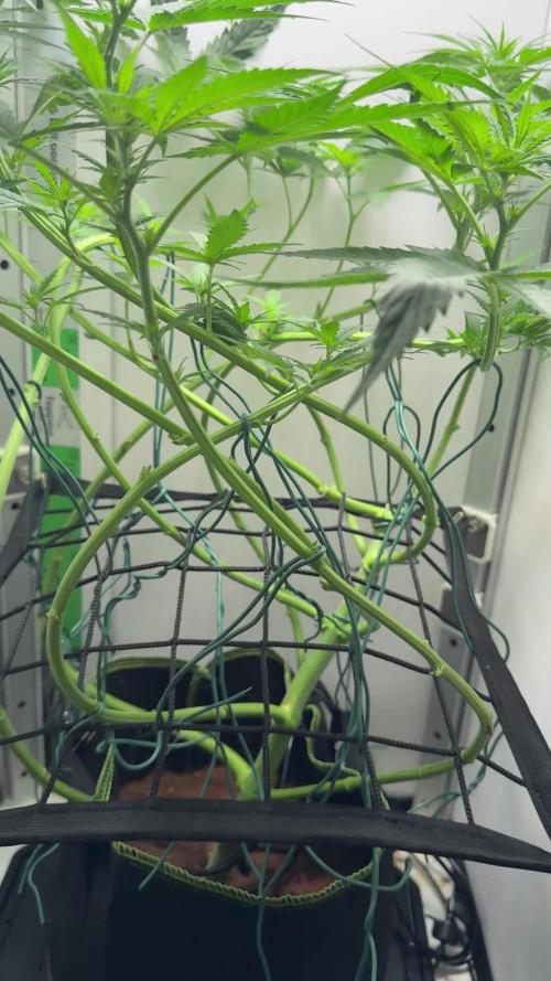 Die Pflanzen haben ihren Stretch voll eingesetzt – das Höhenwachstum ist deutlich sichtbar. • Wuchs: Die Triebe sind stark nach oben geschossen und beginnen, die Blütepositionen zu bilden. Das Netz hilft dabei, die Struktur offen und gleichmäßig zu halten. • Farbe: Leuchtend grünes, gesundes Laub ohne Anzeichen von Stress oder Mangel. • Form & Struktur: Gleichmäßiger Aufbau mit stabilen Haupttrieben – ideale Vorbereitung auf die Blüte. • Gesamtzustand: Vital, stark und optimal im Übergang zwischen Veg- und Flower-Phase.