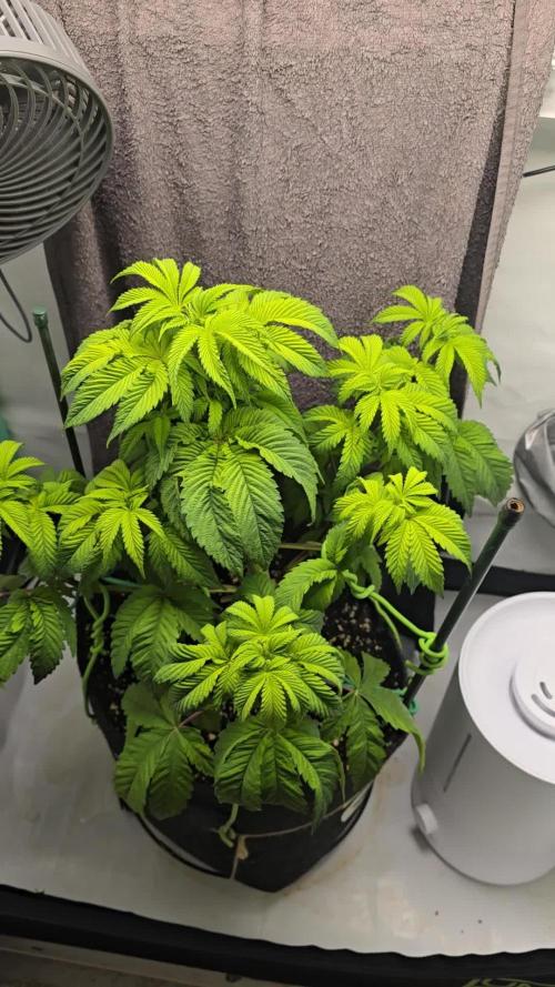 The girl is growing so fast now, drinking 4.5L a day. She could even do with in-between waterings, in my opinion. She's aiming for the stars and shooting for the moon, getting bigger every day and stinking out my room. I had to tie my light higher up with some rope as it wouldn't go any higher, and shoots were getting way too close! I did SCROG when flipping, and I should've been a bit more strict on it (did it longer), but now I realize why SCROG is used. Imagine if I never used it—she would be way too tall. Overall, I'm so happy with how she is growing and can't wait to see the final product. :)
