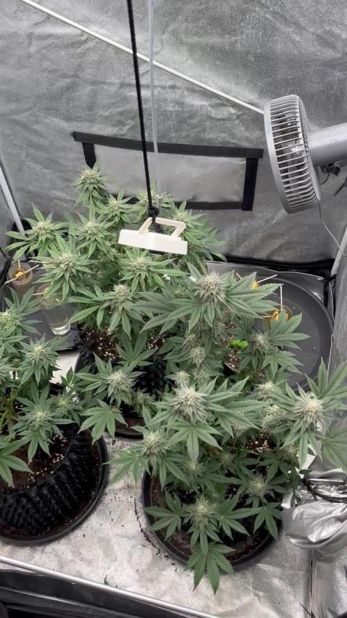 Harvested at beginning of 14th week from seed. Of the three plants that finished in this run, this one probably got the best flush even though it wasn't the longest. Started to see yellow and blue by the time it was cut. Mild trimming at harvest. Went 10 days drying at around 60-70RH. Dried on string in boxes, dry trimmed some, moved to paper bag for a few days where RH ended up at 58. May have over dried slightly. Sealed paper bag inside a plastic bag for a few days before continuing to jarring. My drying process was experimental, but wanted better smell from buds than what I'd achieved with other plants grown with this one. The smaller stunted cheese smelled amazing, but the smell faded during dry/cure and it didn't taste the best. That one got the least days flush, but its potential was still evident.