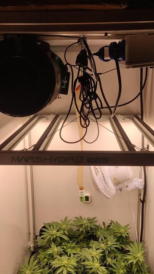 07/04: The ladies keep growing! Aaliyah is now at 33” because of the new bending, Alexis is at 34” (I just bent her main cola down), and Annie is at 25 1/2”. With Alexis at 34” she has also passed my light. Since Aaliyah seems to be doing okay with the bending, I decided to bend Alexis down as well. Annie is going into her stretch. Found a dead fly in tray and a live one on the trap. I guess my problems continue. I gave the ladies a good amount of water (4500mL for Annie!) and am going to leave the next watering for two days now. Hopefully this can help.