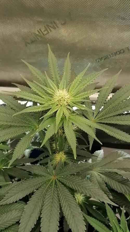 Smells like lime sherbet up in here. LST, light defoliation to get some light on the lower colas. Really watered in today for the first time soaking the media, she is stretching and I see maybe some hairs for pre-flower - hope not too too soon though, I'd like more height than nine inches before she fully stretched