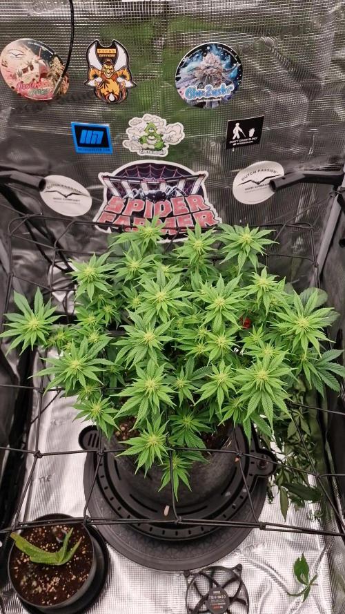 Week 6 Vegetation - "Sam" rate of growth started to increase near the beginning of the week. With the nodes now stretching, I've started to implement tucking of the larger fan leaves under new and smaller shoots. I find this "new growth priority" method paired with LST really maximizes and speeds up the growth in comparison to an untrained plant. Merely anecdotal though!