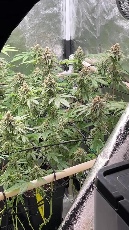 This wraps up the last week of flush for the biotabs, they got 2.5 ml/L of humic acid each feed 3x 4 pints this week. These have a real funky smell to them, cant really put my finger on it, kinda plant musty, really strong smell, maybe skunky or something, main thing is they're getting the chop soon ! Clipped a fair few leaves but the idea is a dry trim and hanging the plants whole for 10-12 days of slow drying before the cure. Man i cant wait to wrap this grow up ! These kinda grew crowded, i can tell because the biotabs and mrB's have a few branches that are anemic, small, useless, so they're all gonna go into the bubble hash, let's see if i can extract anything from these beauties ! wish me luck 🚀