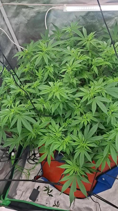 First pistils started showing on the canopy so the flowering period timer started this week. Tops are looking good, forming shape across the net. Stretched branches are being tucked one square across every 3-4 days or tied down. Pulled down most lateral branches applying LST where they weren't long enough to nicely go under the next square across of the net. The net is filling up nicely, with more pruning below the canopy of growth tips. Only pruning a few fan leaves which are stacking - the back and sides are piled up with huge fan leaves. Fertigating with an inflow EC of >1.35 seems to be moving the run-off EC higher - will maintain higher inflow EC until run-off is within acceptable range. Run-off EC Should be within 300 Points of Inflow EC. Run-off EC is now approaching my target since I've increased the inflow EC. Tracking run-off volume/EC/pH at every fertigation event as I manage the feed EC to monitor what the plant is doing/feeding. Fertigation is maintained now to once a day (at lights on) to maintain the target EC. Light period is during the night time to better maintain heat/humidity conditions during light off period (which happens during daytime). ----------------------------------------------------------------------------------------------------------------------------------------------------------------------------------------------------------------------- The grow setup includes ; - Secret Jardin DS120W tent (120cm x 60cm x 180cm) placed inside the bedroom - Mars Hydro SP250 LED light - extraction fan - AC Infinity Cloudline T6 (gives me great control over the environment) - ventilation fans - aquarium heater for nutrients solution (for winter use only) - small oil heater (for winter use only) - small dehumidifier - 20L Airpots (as final pots) and 3.5L general plastic pots (for seedling stage) - Canna Coco substrate mixed with 40% perlite - GHE Flora Trio as base nutrients and various additives - pH and EC/TDS meters - 2x Govee Thermo/Hygro meters (one at canopy, the other at the roots level - these allow for external monitoring and recording) ----------------------------------------------------------------------------------------------------------------------------------------------------------------------------------------------------------------------- Some strain info from Royal Queen Seeds ; An amazing mix of genetics background - Its true genetics are unknown. Some say OG Kush is a mix of ChemDawg with a Lemon Thai and Pakistani Kush. Others say that it’s just a special cutting of ChemDawg from the early 90s. The most obvious trait of OG Kush is its strong, unique, very dank, slightly citrus aroma, almost like fuel or strong detergent. The flavour of OG Kush is equally as strong and dank, with a long-lasting aftertaste. Strong mental and physical high - OG Kush is an extremely strong cannabis strain, with most experienced smokers listing it as one of their favourites. The effect is as strong physically as it is mentally. Though its effect is like an Sativa, the strain's genetics are mostly Indica. The effect is as strong and complex as the flavour. OG Kush takes around 8 weeks to flower and on average the yield is 500 grams per plant.