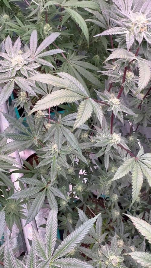 4x4 #1 | Plants are starting to stack bud formations, in week 5 flower 4x4 #2 | Plants are starting to show pistils this week & a active stretch, in week 2 flower Gyat is very easily managed and both phenotypes are looking great, even the 'finicky' plant Scat Queen is a herm and both phenos, I'm still going to run them.. they look good other than. The pheno in week 5 flower smells really good and overall structure is nice but seeded and I'm seeing the 2nd pheno starting to show the same traits.. this experiment shows it's not a stable cross from Elev8 just by the fact every other plant isn't giving this problem and its a 100% rate in 2 different tents. Did some shuffling & added a smaller plant, Sherbie Truffle by Detroit Seed Co in the front right next to Gyat to the left -it is a week behind the others but will fill the space nice. ( Scat Queen back left, Gyat back right and front left, Sherbie Truffle front right ) Keeping the flow smooth growmies 😎