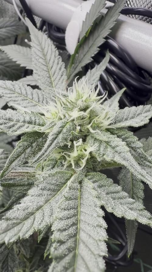 As you can see, the plant remains beautifully compact and low – all without any help or LST! The lighting in the Minigrow does a fantastic job of keeping her wide and low. This week, I removed some of the large fan leaves at the bottom to make room, as there’s quite a bit happening under the canopy 😉. The side branches are developing wonderfully: low, sturdy, and perfectly balanced with the main cola. Over the next few days, I’ll remove another set of fan leaves, but for now, it’s really just a matter of sitting back and enjoying the view. Frosty Tooth is a beauty: healthy, with vibrant green, large, and strong leaves. I can’t wait to see the first “frosty” buds this lady will undoubtedly deliver!