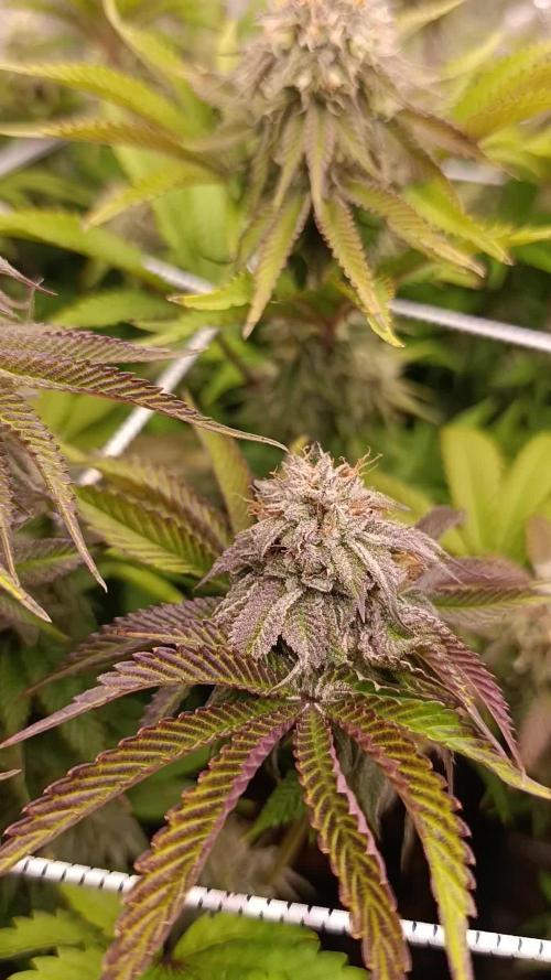 A- Still fattening up, took a Growmie’s advice, she was a little over fed, eased back this week on the nutrients and just used water and Sensi CalMag Extra. Gave her a regular dose Friday and she seems good, no new discoloured/burnt leaves. Tricomes are still showing as clear and cloudy mixed in with a few amber here and there. Watching closely to when I feel she is done, then I will start a water flush cycle for the last few feeds…