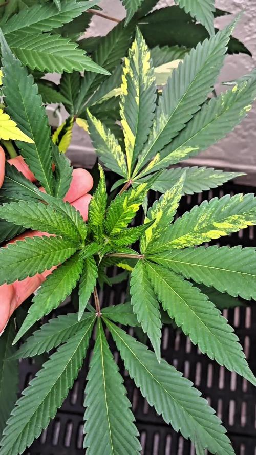 • Leaf morphology: Classic hybrid look—rounded blades, neither narrow “pure sativa” nor broad “pure indica.”