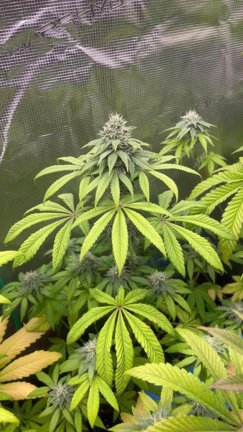 Decided to pull her. She's fully done. Took the 2nd set of her nodes, rough trim & put to quick dry with the plant itself hang drying in shit weather 19-21.5c so she got fully watered before harvest and the RH is kept high at 65-70 to prolong the dry. There is a risk of mold. But with the heat an contest air exchange, its unlikely. Has a lovely cookies sweet smell with a bit of dankness. Also, a floweree smell. Which will go when dried. Really glad so far, even with my high temperatures, now knowing how to dry in summer, I've yet to get any hay smell, (signs the dry went badly against your quality of bud) can be rid of in a long cure but, and early signs of it. Still has an affect on strength. Read the process as something breaks down for it to get like that. And once it happens, there's no getting the potency level back. But, the smell yes. After 2-4 months, depending on the servaity of the hay smell. Here, I'm not sure what will happen yet. I've yet to push a plant to 100% cloudy and 40% ambers.