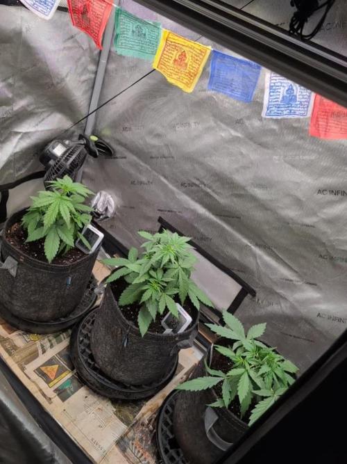 60x60 cm tent in a 1920's peek-in-closet Oversized vent for silence High power DIY LED True SoG 12/12 from seed with 15 plants in 2L pots Watering all plants in bottom tray with 30% of total pot size (10L) WEEK 1 DAY 1 - Germinated in paper towel DAY 3 - Planted into pots + Lights ON at 125w DAY 5 - All plants have broken soil DAY 7 - Slight stretch - Light at 185w WEEK 2 Two of the Iced Out are lagging behind, others are on point - I'm trying to push light and nutes to the max. Extraction fan (AC infinity Cloudline T6) on level 2. DAY 13 - First full watering (10L) with 20 ml Canna Terra Vega DAY 14 - Circulation fan turned on (low) during lights on WEEK 3 Good growth, two Iced Out still lagging DAY 18 - Light at 225w, Extraction fan on level 3 during lights on DAY 20 - 2nd watering, 8L with 30ml Vega + Light at 250w DAY 21 - On point, mostly :) Could've pushed nutes a bit more from the go WEEK 4 DAY 24 - So far this week I'm just kicking back and watching them do their thing. The two lagging Iced Outs are trying to catch up. DAY 26 - Watering 10L with 50 ml Vega (one day too late...) + light on 300w (max) DAY 28 - 4 weeks from popping the seeds, looking good except for the two Iced Outs, one of them is trying to get with the program, the other... Well, some plants are just pricks. WEEK 5 I think this is the week we'll see them take off :) DAY 29 - Plants are starting to show sex, removed 2 Urkle Mints males, the other two are females, the rest are fems so we're down to 13 female plants total with only a single weakling DAY 29 - Watering 8L with 50ml Vega (shouldn't have been later than today!) DAY 33 - plants exploded over the last 4 days and most are stretching and starting to flower DAY 33 - Watering 10L with 60ml Vega (feeding Vega once or twice more then we switch to Flora) DAY 35 - Just cruisin' 😎 WEEK 6 Lots of stretch the past week, flowers are setting in, the laggy Iced Out was culled, 3 plants are a bit behind the others.. DAY 36 - Watering 10L with 50ml Vega DAY 39 - Watering 10L with 50ml Vega DAY 42 - Defoliation WEEK 7 DAY 44 - Watering 10L with 50ml Vega DAY 47 - Switching to flowering nutes - Watering 10L with 50ml Flores WEEK 8 Had to break the stem on the stretchy Sugar Cane to keep it low enough DAY 51 - Watering 10L with 60ml Flores DAY 54 - Watering 10L with 60ml Flores WEEK 9 Starting to chunk and frost up. The 2 Urkle Mints regs are really small and slow but flowering, the slow Iced Out just started flowering and probably won't add up to much by the time the next grow needs to start. Platinum Jelly, Frosted Apricots, and Platinum Terple are looking really good, I knew PJ would kill DAY 57 - Watering 10L with 60ml Flores DAY 61 - Watering 10L with 50ml Flores DAY 61 - Defoliation WEEK 10 DAY 65 - Watering 10L with 50ml Flores + 15ml PK 13/14 DAY 69 - Watering 10L with 50ml Flores + 15ml PK 13/14 WEEK 11 DAY 72 - Watering 10L with 50ml Flores + 20ml PK 13/14 DAY 75 - Watering 10L with 40ml Flores + 20ml PK 13/14 (Last feeding)