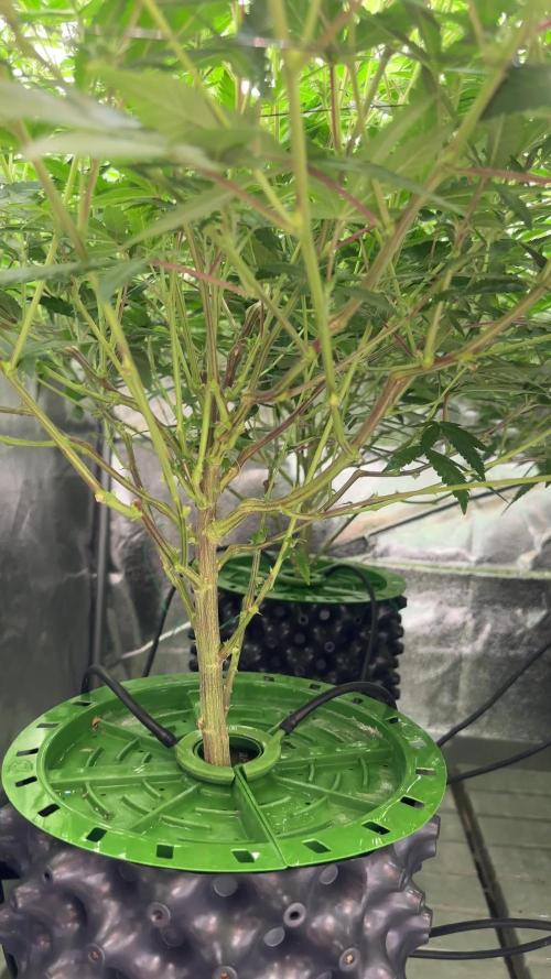 Day 30: Let grow, no water no feed. Thick stalks, RapidStart doing an amazing job on those roots. Tent Temp: 77º RH: 53º PPFD: 700 VPD: .67 kPa Day 31: Watermelon Zkittlez looking slightly better. Great node spacing and structure. Still evidence of mosaic disease but not as much on the new growth. Will continue to monitor. Fed 4ml FloraMicro, 4ml FloraGro, 6ml FloraBloom, 2ml CALiMAGic, 1ml RapidStart, 2.5ml ArmorSi, 1ml Floralicious Plus, 1ml Liquid KoolBloom and 5ml FloraNectar. Solution Temp 70º PH: 5.8 PPM: 950 Tent Temp: 77º RH: 52% PPFD: 750 VPD: .66kPa Day 32: Watermelon Zkittlez almost starting to look normal. New growth does not show much signs of mosaic disease. We'll see what she does in the coming weeks. Tent Temp: 77º RH: 51% PPFD: 800 VPD: .67kPa Day 33: Let grow, no water no feed. Tent Temp: 77º RH: 52% PPFD: 750 VPD: .67kPa Day 34: Watermelon Zkittlez received some pretty heavy defoliation this morning. Removed several small bud sights from the bottom and a few fans. Watered .5gl RO water PH: 6.1 Tent Temp: 75º RH: 55% PPFD: 750-800 VPD: .58 kPa Day 35: Looking healthy and happy. Starting to get a slight skunky smell in the tent. Tent Temp: 75º RH: 55% PPFD: 750-800 VPD: .58 kPa Day 36: Ready for feed again. Cutting out FloraMicro on this feed, Cosmo and + Speed(s) showing slight signs of nitrogen toxicity. Fed 4ml FloraGro, 6ml FloraBloom, 2mg CALiMAGic, 1ml Floralicious Plus, 2.5ml Armor Si, 1ml RapidStart, 1ml Liquid KoolBloom and 10ml FloraNectar PH: 6.1 Solution Temp: 71º PPM: 925 Tent Temp: 76º RH: 52% PPFD: 750-800 VPD: .67 kPa