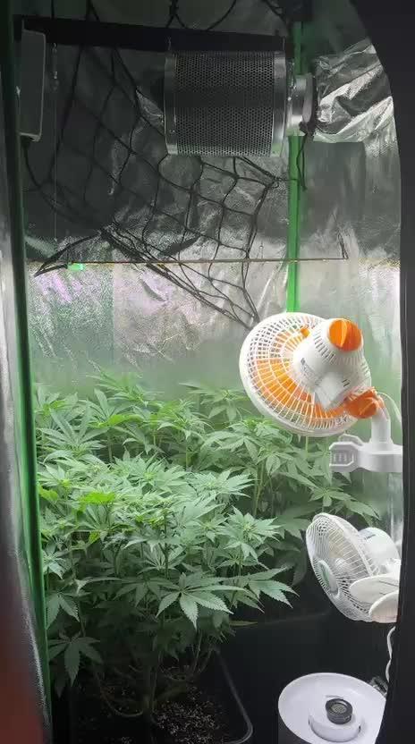 So we are in week 2 of flower I ran out of Dutch pro and my hydro shop didn't have any in stock so I had to swap to canna 450ml A&B I've also added some bud blood. So today I did some defoliation to anything below my scrog net and tucked some of the bigger fan leaves to expose the new bud sites. I also raised my light a few inches to allow the ladies to grow into it. 21/5/21 The girls are growing fast I did some defoliation 2 days ago and I had to repeat today 26/5/21 Took some fan leaves off that where blocking bud sites only a small handful needed to be removed, I gave them a feed ppm 946 ph 6.3, bud sites are looking nice and healthy I've got plenty of air flow throughout my tent, have yet to notice any aroma but still very early days. That's all for now gays and gals happy growing and pleasant smoking ;)