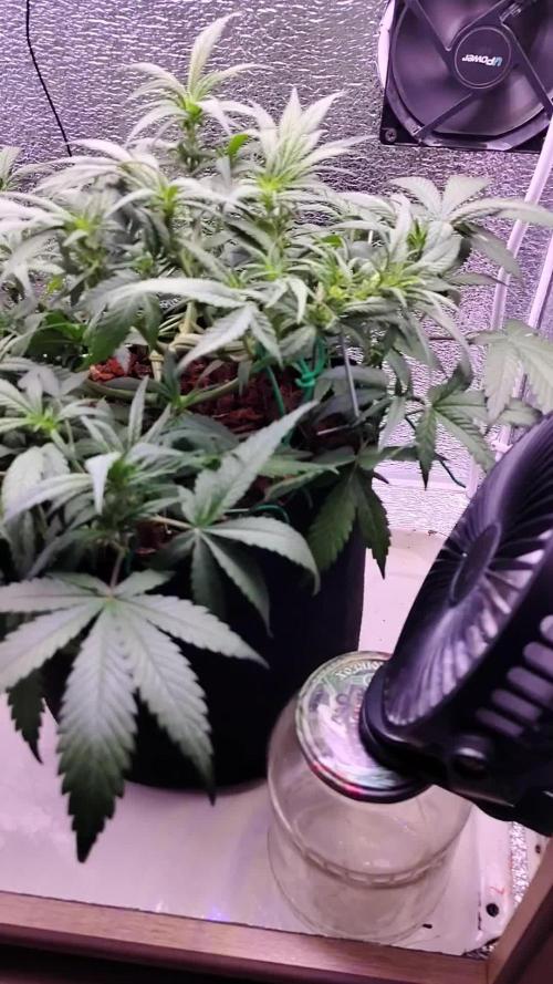 Week 5 Light cycle=18/6 Light Power=120w Extractor controller settings High temp= 25c Low temp= c Temp step=0c High Rh= 58% Low Rh= % Rh step=0% Speed max=7 Speed min=1 Smart controller settings (during lights on). Lights on=06.00am Radiator on= below 21c Radiator off= above 22c Smart controller settings (during lights off). Lights off=00.00am Radiator on= below 18c Radiator off= above 19c VPD aim=0.6-1.3 DLI aim=28-34 EC aim=1.7 PH aim=6.3 Thur 25/1/24 💧💧💧💧💧💧💧💧💧💧💧💧💧💧💧💧 Method= automatic Feed=water Neutralise=0.1ml/L Roots=0.2ml/L Easy Ph down=0ml/L Ec=0.25 PH=6.4/6.6 Time start=12.00pm Finish time=13.05pm (7×5 minute runs with 5 minute gaps) Total flow rate=200ml/min Flow rate per plant=50ml/min. Total volume made=12L Total volume left=5.5L Total volume used=6.5L Volume per plant=1.6L (Est) Runoff. Total runoff=0L Ec= PH=/ Did not work properly so need to sort it out. Total flow rate=185ml/min Flow rate per plant=46ml/min. Ran for an extra 15 mins while sorting out system. Should be about 200ml/min now (50ml/min each plant). 💧💧💧💧💧💧💧💧💧💧💧💧💧💧💧💧 #2 (Day 29) 📋 didn't quite get the amount of water it was supposed to. Extractor controller settings High temp= 25c Low temp= c Temp step=0c High Rh= 56% Low Rh= % Rh step=0% Speed max=8 Speed min=2 Smart controller settings (during lights on). Lights on=06.00am Radiator on= below 21c Radiator off= above 22c Humidifier on= not in use. Humidifier off= not in use. Dehumidifier on= not in use Dehumidifier off= not in use Smart controller settings (during lights off). Lights off=00.00am Radiator on= below 18c Radiator off= above 19c Humidifier on= not in use Humidifier off= not in use Dehumidifier on= not in use Dehumidifier off= not in use VPD aim=0.6-1.4 DLI aim=35-40 EC aim=1.9 PH aim=6.2 Fri 26/1/24 #2 (Day 30) 📋 defoliate lower leaves that hardly get any light. Sat 27/1/24 #2 (Day 31) 📋 H=44cm D=38cm DLI=33.5 Raised light about 10cm Increased light power to 140w H=44cm D=47cm DLI=29.5 Sun 28/1/24 I have decided today is going to be the last day of veg before I flip to flower. Lights will have come on today at 6.00am and go off at 10.00pm, they will get 14hrs light today and tomorrow will be day 1 of 12/12. 💧💧💧💧💧💧💧💧💧💧💧💧💧💧💧💧 Method= automatic Feed=Veg nutes. Neutralise=0.1ml/L Silicon=1.0ml/L Calmag=1.0ml/L Terra grow=4.0ml/L Roots=0.2ml/L Easy Ph down=0.125ml/L Ec= 2.05 PH=6.1/6.3 Time start=12.00pm Finish time=13.45pm (11×5 minute runs with 5 minute gaps) Total flow rate=181ml/min Flow rate per plant=45ml/min. Total volume made=12L Total volume left=2L Total volume used=10L Volume per plant=2.5L (Est) Runoff. Total runoff=1L Ec=2.7 PH=6.1/6.3 💧💧💧💧💧💧💧💧💧💧💧💧💧💧💧💧 #2 (Day 32) 📋 With no information for flower time I'm going to have to guess she will be finished in 45-60 days. I removed quite a few lower nodes that probably won't break through the canopy, they where ideal candidates for clones. Light cycle=12/12 Light Power=140w 58% Extractor controller settings High temp= 25c Low temp= c Temp step=0c High Rh= 56% Low Rh= % Rh step=0% Speed max=8 Speed min=2 Smart controller settings (during lights on). Lights on=10.01-21.59 Radiator on= below 21.5c Radiator off= above 22.5c Smart controller settings (during lights off). Lights off=22.00-10.00 Radiator on= below 18c Radiator off= above 19c Mon 29/1/24 Lights on at 10.00am off at 22.00pm #2 (Day 33)(Day 1 flower) 📋 H=49cm D=42cm DLI=23.0 At 9.00pm increased light to 150w H=49cm D=42cm DLI=24.0 Tue 30/1/24 #2 (Day 34)(Day 2 flower) 📋 Wed 31/1/24 #2 (Day 35)(Day 3 flower)**** 📋 H=54cm D=37cm DLI=27.0 🚿 foliar sprayed (Sumo Boost 2ml/L). She got flipped into flower on day 32, has caught up to the others in height and even overtook one plant. The cola I stuck back on is a lot shorter then the other 4. Back soon. Take it easy.