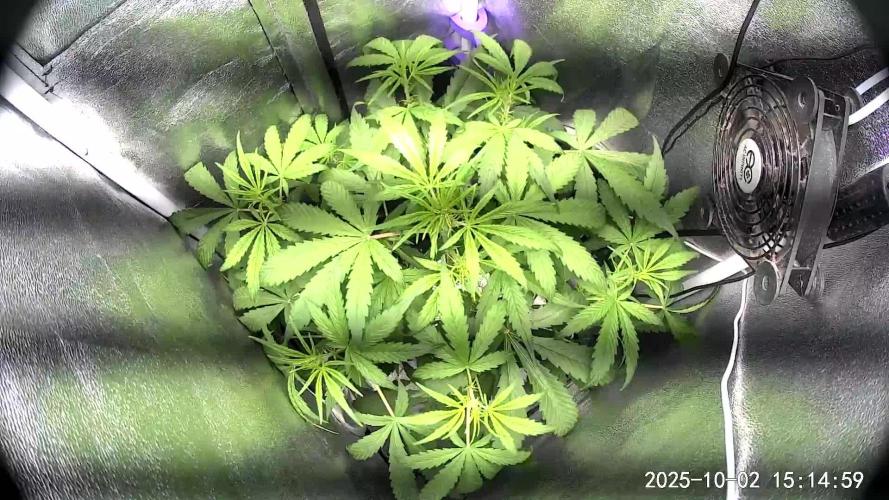 This week, we’ve fine-tuned the spectrum to push the plants into full resin-production mode. I’ve reduced the white light intensity to 40% while keeping the reds and UVs running at 100%. This shift focuses energy on the wavelengths that directly stimulate secondary metabolite production—especially trichomes. Red light enhances flower development and density, while UV exposure encourages plants to produce protective compounds, like cannabinoids and terpenes, as a natural defense. This balance between lower photosynthetic pressure and high-spectrum stimulation is helping the girls finish strong, frosty, and full of character.