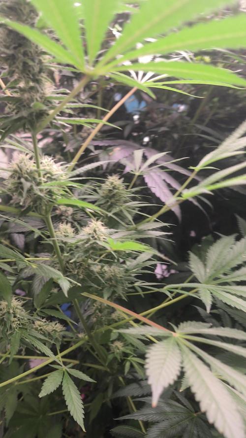 This girl has been happy all week and praying hard.....sheâs just a shorter girlđ However, she had a god growth week and her top cola is reaching up tall and proud! Another sign that she just needed more Veg time for consistency across the canopy is all. She was fed some fulvic acid on Monday to encourage stretch through Gold Storm at 5ml/Lđ€ Her tricombs have come on strong as well at the end of the week. Her buds are not that large yet but she seems to feel to almost be 5 or 7 days behind the other girls??? She was stripped of a number of leaves, a couple of lower branches and bud sites this week. She has some good internode spacing and itâs allowing some more light down lower. Thinking she is going to be more of nugs rather than colas? Here leaves are up hard so hard that the increase in light intensity at the end of the week will only benefit this girl given her distance from the light.