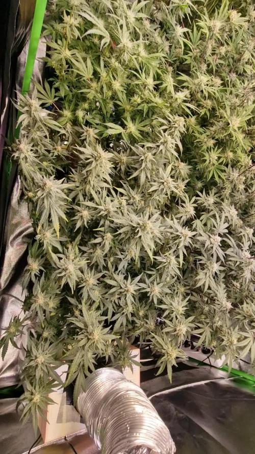 Day 90 since seed touched soil. Girl is on final stretch, took all nutes out last watering. Today gave 6.3 phed water for last time, maybe if few other girls will show signs of bulking, ill do one more watering. Last week installed dehumidifier, so all environment is way better. Most mature girl from all, youngest, but fastest to bulk up. Cant wait to take her out from scrog and see real beauty of her. Happy Growing !!!