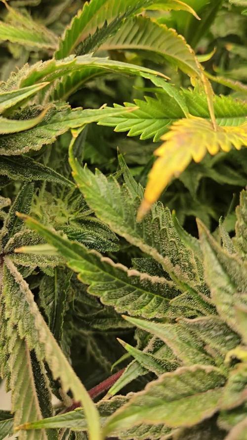 Day 127 The plante shows well-developed buds covered in a healthy layer of trichomes. The flowers appear to be in their late flowering stage, with calyxes visibly swelling and the structure becoming more compact. The leaves show a mix of green and yellow tones-typical late-flower fade as the plant draws stored nutrients from the foliage. Some fan leaves are yellowing from the center outward, suggesting normal senescence rather than a deficiency issue at this stage. The buds themselves look stable, frosty, and maturing steadily.