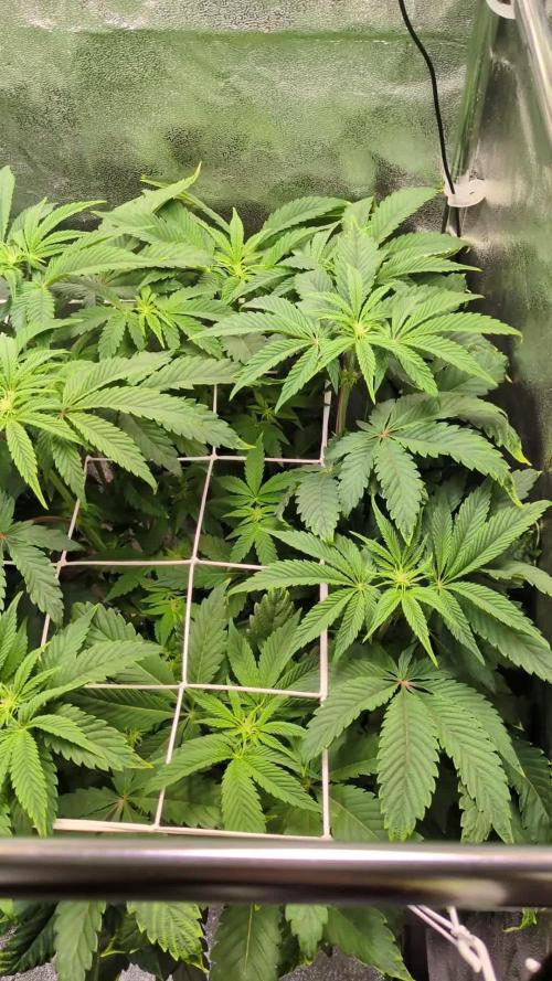 •••••••••••••••••••••••••• Sept. 28 - Oct. 4 •••••••••••••••••••••••••• CULTIVARS: •••••••••••••••••••••••••••••••••••••••••••••••••••••••••••••• WEDDING CAKE: STARTED = 8/10 • BLOOM = 10/1 RED HOT COOKIES: STARTED = 8/10 • BLOOM = 10/1 CHOCOLATE MINT OG: STARTED = 8/10 • BLOOM = 10/1 WILDBERRY: STARTED = 8/10 • BLOOM = 10/1 CINDERELLA 99: STARTED = 8/10 • BLOOM = 10/1 PEYOTE WIFI: STARTED = 8/10 • BLOOM = 10/1 SUGAR TITS: STARTED = 8/10 • BLOOM = 10/1 MONSTER ZKITTLEZ: STARTED = 8/10 BLUEBERRY: STARTED = 8/10 • BLOOM = 10/1 BLUE DREAM: STARTED = 8/10 • BLOOM = 10/1 HELL'S ANGEL OG X PLATINUM KUSH MINTS: STARTED = 8/10 • BLOOM = 10/1 COTTON CANDY CANE: STARTED = 9/5 • BLOOM = 10/1 •••• EXTENDED VEGETATIVE PERIOD •••• MELON GUM: STARTED = 8/10 GREEN GELATO: STARTED = 8/10 FRENCH COOKIES: STARTED = 8/10 SOUR LEMONAID: STARTED = 8/10 LSD: STARTED = 8/10 GORILLA x COOKIES: STARTED = 8/23 •••••••••••••••••••••••••••••••••••••••••••••••••••••••••••••• WEEKLY SUMMARY: •••••••••••••••••••••••••••••••••••••••••••••••••••••••••••••• 🙋‍♀️Fo' Twenny here!🙋‍♀️ Back with another update on the viewer selected multi strain SOG. If you're just joining us, we have these photo-dependant ladies vegging in our 48"x 24" VIVOSUN tent. I have been doing a lot of heavy defoliation and pruning the past week. I also made a few upgrades in the bloom tent and moved a few of the cultivars into bloom under 12/12. Also, I realized my BlueLab Conductivity Meter has the option to switch to EC. Since EC is the most accurate way to measure the nutrient concentration in a solution, I will now be measuring and reporting EC readings rather than PPM. I am honestly super stoked about every single plant in this run. That said, I think I am probably most impressed by the 🍭🎅🏻 COTTON CANDY CANE lady from Emerald Triangle Seeds. She is incredibly vigorous. She was started nearly a month after all the others (except the 🦍🍪 GORILLA x COOKIES) and has already caught up to some of the taller plants in the run. Special thanks to those guys for sending the freebies for me to try out! Definitely want to try more from this breeder! She is almost a month behind the other plants and is almost as tall as the tallest cultivars started on 8/10. All in all, everything looks great. Any advice, suggestions, or constructive criticisms are always welcome. Now, for the weekly break down! •••••••••••••••••••••••••••••••••••••••••••••••••••••••••••••• THIS WEEK'S BREAK DOWN •••••••••••••••••••••••••••••••••••••••••••••••••••••••••••••• 9/30 - Day 52 for Majority of the Garden - 🍭🎅🏻 COTTON CANDY CANE: Day 26 - 🦍🍪 GORILLA x COOKIES: Day 39 °°°°°°°°°°°°°°°°°°°°°°°°°°°°°°°°°°°°°°°°°°°°° 🎥 FILMING DAY! 🎥 •••••••••••••••••••••••••••••••••••••••••••••••••••••••••••••• 10/1 - Day 53/Day1 of Bloom for Majority of the Garden - 🍭🎅🏻 COTTON CANDY CANE: Day 27/Day of Bloom - 🦍🍪 GORILLA x COOKIES: Day 40 °°°°°°°°°°°°°°°°°°°°°°°°°°°°°°°°°°°°°°°°°°°°° 📸 PHOTOSHOOT! 📸 🎥 FILMING DAY! 🎥 👩‍💻 UPGRAYED! 👩‍💻 - Added a BOTANICARE 48" x 48" low-tide flood tray on top of six 4" tall cinder-blocks with a low-profile motorcycle oil-pan for the water to drain into beneath the flood tray. - I transplanted eleven cultivars into black 12" tall Active Aqua brand 12" x 12" square pots and inserted 3' fiberglass garden stakes into the center of the rootball near the main stem of each plant. Each stake goes to the bottom of the 12" pot. All transplants have nice solid root balls due to being slightly rootbound. I knew I'd likely run short on premixed soil, so I decided to transplant the largest plants first. Of course, I ran out of soil after 11 plants were transplanted. It seems like I used a lot more soil than usual with this method and in tgese pots. - I mixed a new batch of soil using the same recipe. I will give the five smallest gorls a few more days to grow taller. That will give this batch of soil a little time to innoculate. - I moved the 11 transplants into the 96" x 48"bloom tent under 12/12 lighting schedule. 🚿FEED DAY!🚿 She received approximately 1 gallon of solution. I mixed 12 gallons of solution for all the plants I have in flower. 1 gallon of that was then measured and fed to this cultivar. 👩‍🔬NUTRIENT SOLUTION👩‍🔬 ⬇️Mixing Rundown⬇️ The solution starts with 12 gal tap H2O through two kdf filters mixed in a 36 gallon reservoir. The solution is applied via wand sprayer powered by a submersible pump attached to a garden hose. Nutrients and additives are added to the reservoir in the order listed below and thoroughly mixed uding a plastic stir spoon. The reservoir is oxygenated by four 4 inch air stones. Start pH: 7.8 Start EC 1.0 TEMP: 74°F 4 ml/gal - Blue Planet Gold Shield Silica Supplement .5 tsp/gal - Fox Farm Gringo Rasta Cal-Mag 3 tsp/gal - Fox Farm Big Bloom 1.5 tsp/gal - Fox Farm Grow BIG .5 tsp/gal - Fox Farm Boomerang .25 tsp/gal - Fox Farm Wholly Mackerel .25 tsp/gal - Fox Farm Kelp