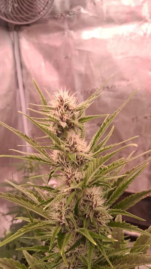 👉With each day it grows a noticeable amount. Its staying short and the leaves are actually touching the media on the lower set. Its actually on its 3rd node, and i will probably top it on the 4rth. I lowered the light from 36 to 24". This week i will lower it again to 18". The plant is short but its growth is still vigorous enough. under the leaves there is vegitation emerging as well. I like the fact that its staying short, I will probably need every inch of of my tent so the longer its stays short and grows like a bush, the better.