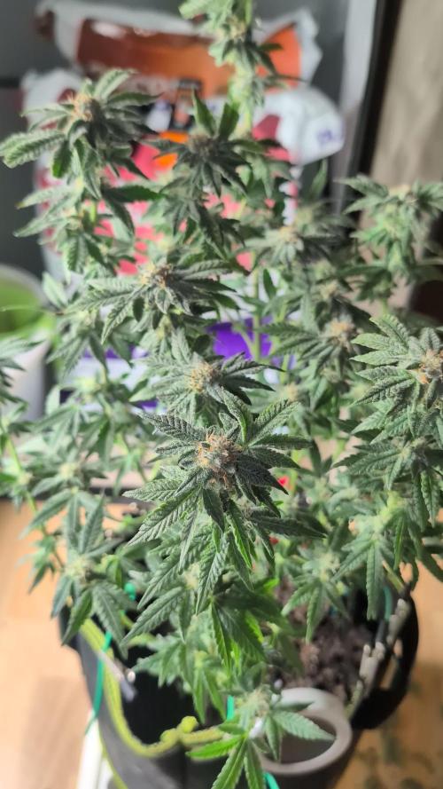 Hello Diary. Finished and the fifth week of flowering, a total of the eighth week, Purple Punch looks wonderful. another week or two and there will be a harvest. The flowers themselves are well filled, and are hard to the touch, and the scent is amazing. As you can see in the photos, the shape of the plant is beautiful, as if I was doing some LST, but I just did defoliation from the lower branches. The leaves are a beautiful healthy green color, here and there some leaves have become more yellowish with a slight purple tinge, which are the first signs that the harvest is approaching. Watering is every three days, I stopped adding nutrients, I only regulate p.H of water to values ​​between 6.0 and 6.5. Conditions on the Farm are satisfactory, the temperature is around 25 degrees while the humidity is below 40%. Here's what it looked like last week: 17/03/2021 - Day 50. Watering. I prepared a total of 7 liters of water, adjusted the p.H to 6.3 and watered all three plants on the farm evenly. Temp / Humidity on the farm - 24.5 degrees and 38% humidity. 20/03/2021 - Day 53. Watering. The procedure is the same as three days ago. Temp / Humidity on the farm - 25.1 degrees and 34% humidity. 23/03/2021 - Day 56. Watering and photography. As for watering, the same procedure as three days ago, after which I photographed Watermelon and her roommates, two Purple Punch. Now I have to water and wait for the right moment. I check with a microscope the development of trichomes but they are still transparent. That’s it for this week, see you soon.