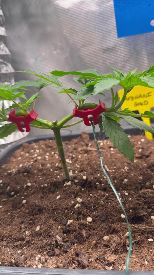 Transplanted into the 5 gal smart bucket. Branches seem to be growing again. All main branches are tied down now, will take clones from the lower banches this week. But the red stems are worrying, I think she's stressed from repotting but I will wait and see. But the yellow new growth I will have to keep an eye on and do some reading. I was considering repotting to a 5 gal smart pot because I have the space but should leave it a while so she can recover. Thinking about what to do for flowering lights. don't know if low end LEDS might be a better option the cfls I have now.