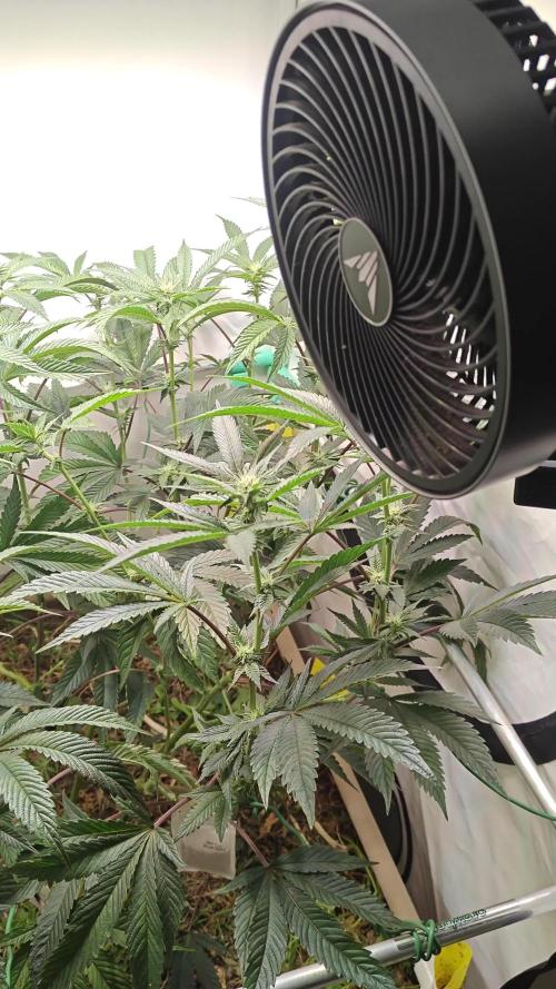 The week starts Monday, Jan-13 in flowering stage. The plant is growing fast, stretching long and I'm constantly tying down branches to maintain an even canopy. There's also a stronger scent of lemon already in the tent. Carried out substantial defoliation of almost all the big fan leaves and a few little stems that were not likely to make it above the canopy. Avoided defoliating the major cola branches. This encourages the plant not to waste resources on a node which is only going to produce “popcorn” buds. The plants reacted well to the defoliation and were looking good by the end of the light cycle for the day. The net is completely full and this will be the last week of applying any LST as part of the ScrOG setup. Light is maintained at 30cm distance from canopy, with daily fertigation at lights on - watering almost 3L per day. Lowered the average RH in the space to 50%. ----prior 4 weeks updates ------------------------------------------------------------------------------------------------------------------------------------------------------------------------------------------- ----------------------------------------------------------------------------------------------------------------------------------------------------------------------------------------------------------------------- The week starts Monday, Jan-06 in flowering stage. The net is filling up nicely with the ScrOG process being enjoyable - just tucking branches nicely under squares once stretched enough. Lost a branch end with 3 nodes accidentally whilst tucking away so now I'm super careful. The Sativa dominant strain is stretching nicely and bends easily. Minor defoliation of lower branches and fan leaves continues daily. Light is maintained at 30cm distance from canopy. ----------------------------------------------------------------------------------------------------------------------------------------------------------------------------------------------------------------------- The week starts Monday, Dec-30 in vegetative stage - switching the light regime to flowering. Initiated flowering with an extended dark period prior to switching light regime - this practice is supposed to promote a faster initiation of flowering by the plant. Maintain lights off from Dec-31, 10:00 until Jan 1 - 18:45 allowing a 32hr darkness period prior to switching the light regime. Light regime is set for 12.5/11.5 on/off allowing me a better maintenance window for my living situation. Both plants are growing fast and strong, showing their genetic traits. Some shoots are going through the net already. Have started to tuck branches as they grow to fill up any gaps. Did minor defoliation on both plants near their stem base and centres. Some green algae on roots/coco medium on the surface of the pot. Have defoliated some more which hopefully helps with air circulation at the area. Will monitor over the week - may need to decrease watering frequency, although they seem to be keeping up drinking. Lowered the High Humidity setting of the extraction fan to 60% - which effectively keeps it running at least 75% of the time, and removed the humidifier. Will monitor and adjust as necessary lowering the setting to 50% in a few weeks whilst flowering. ----------------------------------------------------------------------------------------------------------------------------------------------------------------------------------------------------------------------- The week starts Monday, Dec-23 in vegetative stage. Installed the ScrOG net - Set at 20cm from the base of the plants, being 55cm from ground. The plant is showing great growth, lots of branching and new growth sprouts. A few branches are beginning to come through the net and almost all main branches are now tied down horizontally after the two recent toppings. Applied more LST and will wait for the branches to reach the net and start tucking. The AC Infinity fan is currently only running intermittently with its current settings. This seems to impact the utilisation and effectiveness of the carbon filter in use. The desired outcome is for the fan to be running for longer periods whilst in Auto config. Lowered the High Level Humidity from 70% to 60%, and more importantly, lowered the Max Speed from 4 to 2 with the intent that a lower fan speed will result in longer periods where the extraction fan is operated to remain below threshold targets for the grow space. Plant growth continues to be strong at the end of the week. Big fan leaves near the top are beginning to look a little serrated and dark, similar to the start of this grow. This may be due to the extra CalMag being added which was the issue at the start of the grow. Will keep monitoring and half the CalMag dosage on next feed. Importantly, I have learnt nutrient mixing of the CalMag should be done prior to the Canna Coco A & B. To date I have done the opposite which may explain my earlier issues. Fertigating daily at the start of the light cycle. One more week of vegetative growth before switching to flowering although I may need to switch earlier due to the vigorous growth and considering the stretch yet to come. ----------------------------------------------------------------------------------------------------------------------------------------------------------------------------------------------------------------------- ................................. ----------------------------------------------------------------------------------------------------------------------------------------------------------------------------------------------------------------------- My grow setup includes; - Secret Jardin DS120W tent (120cm x 60cm x 180cm) placed inside the bedroom. Passive intake of air is from a closed off section of the room where the central heating boiler sits - the intake is warm air (20 degC.) and fairly dry (40% RH) during the winter months. - Mars Hydro SP250 LED light - extraction fan - AC Infinity Cloudli