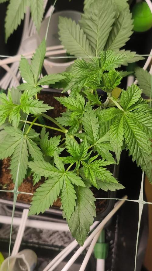 - **Jour 18-19 (4-5 février) :** Développement accéléré ; structure à 5 nœuds visible, avec branches secondaires vigoureuses grâce au FIM précédent. Pose du premier treillis au jour 18 pour brider la hauteur à 15 cm et encourager l'expansion latérale (envergure atteignant 35 cm). Plantes belles et robustes, couleur verte profonde, sans pests (IPM préventif : Rotation d'huiles essentielles et neem effectuée). pH stable à 5,8-6,0 ; EC tank 1,6 constant.