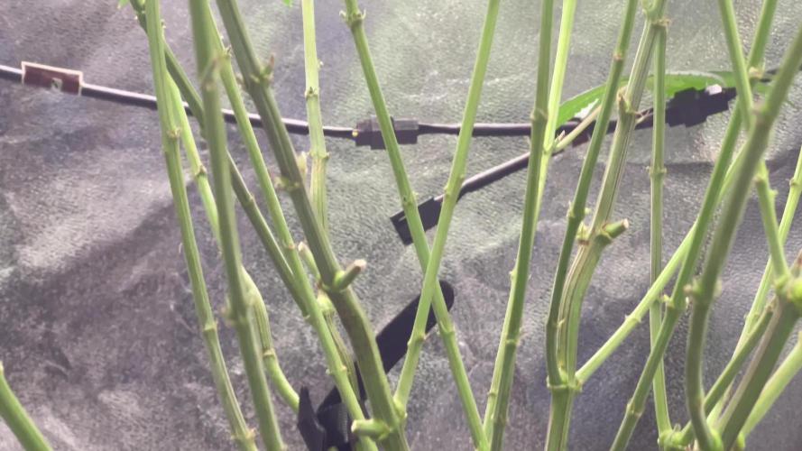 Los cogollos han seguido compactándose, y esa estructura tan peculiar, similar a una coliflor apretada, se acentúa cada vez más. Es una forma poco común, pero muy llamativa, que aporta un contraste interesante respecto al resto del cultivo. La densidad de las flores y la distribución de la resina van en aumento, lo que indica que la planta está en plena madurez floral.