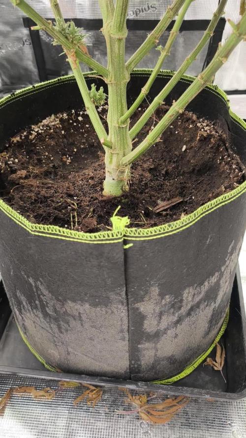 Moved her to her final bucket, sat for a few days - then topped her down to the 3rd node, defoliating the 1st nodes completely It recovered and is now getting a set of nutes 24hr light cycle 7ph water