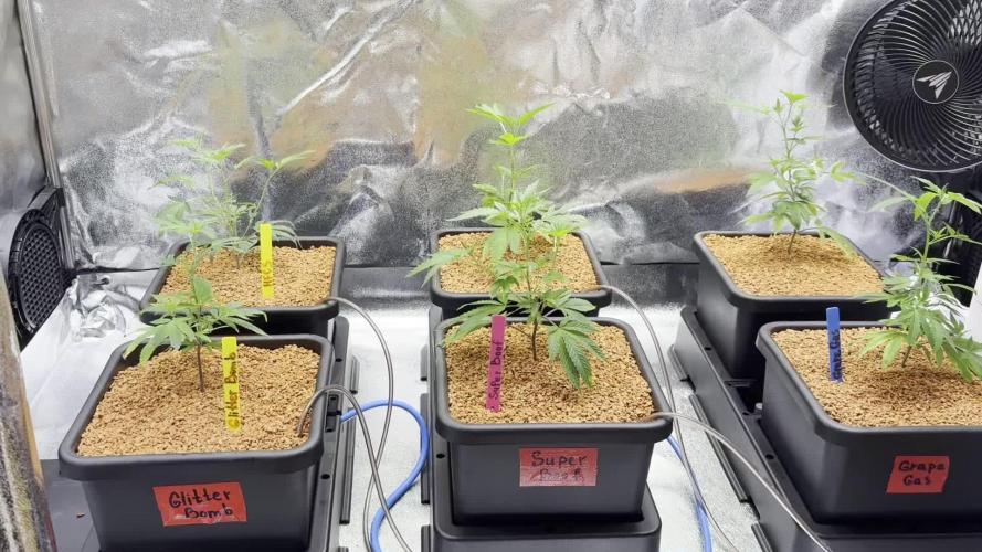 Week 15 days 99-105 . I'm am flushing all plants with 1 gallon of filtered water each. I've reduced the light cycle from 18 to 14 hours to reduce heat stress. It may reduce yield as well based on comments I've read in other growers diaries. An oz per plant would be nice. Of course more would be better but an oz makes a pound of cannabutter. Reducing the light hours is reducing the purpleness in the stems of og kush and gorilla glue but Purple chill still has purple stems