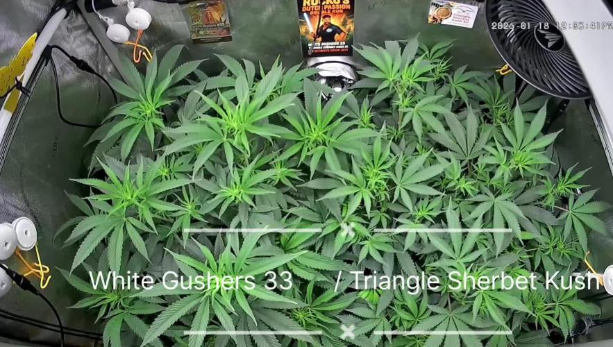 🌿 Blütetag 45 | Tag 105 gesamt Klima – Frühling? Draußen bleibt es wechselhaft: feuchte Phasen, kühlere Tage, dann wieder mildere Abschnitte. Ein klarer Rhythmus will sich noch nicht einstellen. Im Zelt selbst lief es deutlich kontrollierter als zuletzt. Die VPD-Werte lagen häufiger im Zielbereich, die Kurven wirkten ruhiger und berechenbarer. Solche Umschwünge zeigen sich dennoch im Detail. Stoffwechsel und Wasserhaushalt reagieren sensibel auf Veränderungen – besonders im Blattbild wird sichtbar, wie fein die Pflanzen abgestimmt arbeiten. Sie stabilisieren sich wieder, aber jede Schwankung hinterlässt ihre Handschrift. 🌿 Pflanzenstatus White Gushers 33 Sie bleibt die sensiblere Kandidatin. An exponierten Trieben zeigen sich kleine Nekrosen und leichte Transportanzeichen. Die Flecken haben leicht zugenommen – es wirkt, als würde sie einzelne Blätter gezielt aufgeben und Energie in die Blüten verlagern. Diese Woche wurde punktuell entlaubt. Nur dort, wo Blätter übereinander lagen oder sich gegenseitig Licht nahmen. Ein bis zwei zusätzliche Blätter sind gefallen – bewusst moderat. Das Stacking läuft weiterhin sehr stark. Die Buds bauen sichtbar auf und werden kompakter. Beim Trichom-Check in der Nahaufnahme war ich ehrlich überrascht: Es sind bereits deutlich mehr trübe als klare Köpfe zu sehen. Für Blütetag 45 ist das weiter, als ich erwartet hätte. Ob die stabilere VPD-Phase die Reife beschleunigt hat – oder ob die vorherigen Schwankungen einen Impuls gesetzt haben – bleibt offen. Beobachtung läuft. Triangle Sherbet Kush Weiterhin die ruhigere Erscheinung im Zelt. Sie reagiert gelassener auf Schwankungen und zeigt weniger ausgeprägte Blattspuren. Auch hier wurde punktuell ausgelichtet – minimal gezielter als bei der White Gushers, aber weiterhin sehr zurückhaltend. Das Stacking läuft sauber und konstant. Optisch wirkt sie noch etwas weißer in den Pistillen, aber auch hier zeigt der Trichom-Check eine weiter fortgeschrittene Entwicklung als erwartet. Sehr stabiler Eindruck – mit der Tendenz, früher reif zu sein als der Kalender vermuten lässt. 🌸 Blüten & Duftbild Die Buds verdichten sich weiter, die Harzschicht wird deutlich kräftiger. Aromatisch zeigt sich jetzt ein klares Profil: Mehr Frucht als Gas. Die fruchtigen Noten stehen im Vordergrund – süßlich, reif und präsent. Darunter liegt eine würzige Basisnote, die dem Ganzen Tiefe verleiht, ohne dominant zu wirken. Beim Öffnen des Zeltes kommt zuerst Frucht. Die Würze trägt im Hintergrund. Die White Gushers 33 wirkt heller und klar fruchtbetont. Die Triangle Sherbet Kush bringt etwas mehr Tiefe mit, bleibt aber ebenfalls im fruchtigen Spektrum. Kein Diesel-Brett – sondern Profil. 💧 Nährstoffe Konstant gefahren: CalMag: 1,5 ml/L Bloom: 1 ml/L Keine Anpassungen. Keine Experimente. Stabilität vor Aktionismus. 🐞 IPM / Biologischer Pflanzenschutz Im Einsatz: Florfliegenlarven Raubmilben Gelbtafeln Nematoden (erneut gegossen) Die Nematoden wurden diese Woche wieder eingebracht – das Intervall war fällig. Durch die insgesamt guten Bedingungen haben die Trips wieder etwas zugelegt. Kein akuter Befallsdruck, aber sie sind präsent und sichtbar aktiver. Es bleibt ein begleitender Prozess. Aufmerksamkeit ja – Überreaktion nein. 🔎 Ausblick Die kommenden Tage verlangen vor allem Beobachtung. Wenn sich die Trichomentwicklung in diesem Tempo fortsetzt, könnte der geplante Erntezeitpunkt nach vorne rücken. Klima stabil halten. Nicht unnötig eingreifen. Sauber Richtung Reife führen. . 🔎 Wochenfazit – Ruhe bewahren Blüte ist kein Sprint, sondern Timing. Wer jetzt hektisch eingreift, nimmt mehr als er gibt. Also bleibt das System ruhig. Die Pflanzen arbeiten – ich lasse sie. Umschwung draußen. Fortschritt drinnen. — Rocko 🌿🔥💚 🌿 Flower Day 45 | Day 105 overall Climate – Spring? Outside conditions remain inconsistent: humid phases, cooler days, then milder stretches again. A stable rhythm still hasn’t really settled in. Inside the tent, however, things felt noticeably more controlled than before. VPD values stayed within the target range more often, and the curves looked calmer and more predictable. Even so, these shifts leave subtle marks. Metabolism and water balance react sensitively to environmental changes — especially visible in the foliage. They stabilize again, but every fluctuation leaves its small signature. 🌿 Plant Status White Gushers 33 She remains the more sensitive one. Small necrotic spots and slight transport signs are visible on exposed branches. The spotting has increased slightly — it feels like she’s deliberately letting go of certain leaves to redirect energy into flower production. Selective defoliation was performed this week. Only where leaves overlapped or blocked light. One or two additional leaves were removed — intentionally and moderately. Stacking continues beautifully. Buds are building strongly and tightening up. During a close trichome inspection, I was honestly surprised: There are already significantly more cloudy heads than clear ones. For Flower Day 45, that’s further along than I expected. Whether the more stable VPD phase accelerated maturation — or whether previous VPD fluctuations triggered a stress response that pushed development — remains an open question. Observation continues. Triangle Sherbet Kush Still the calmer presence in the tent. She handles fluctuations more steadily and shows fewer visible leaf reactions. Selective defoliation was done here as well — slightly more targeted than on White Gushers, but still restrained. Stacking is clean and consistent. Visually she still shows more white pistils, yet trichome development also appears more advanced than the calendar would suggest. Very stable overall impression — with signs that maturity may arrive earlier than planned. 🌸 Flowers & Aromatic Profile Bud density continues to increase, and the resin layer is becoming noti