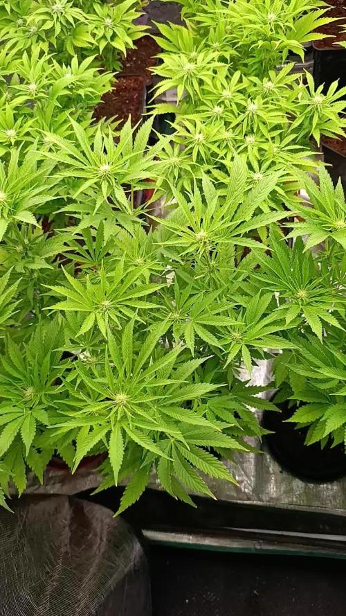 Semana 4 El estiramiento prácticamente se detiene y la planta entra en fase de floración activa. Los puntos florales ya forman pequeñas coronas definidas en cada punta, con los cálices apilándose y los primeros indicios de volumen real. Los pistilos siguen emergiendo con vigor, marcando el inicio de la densificación. La estructura se mantiene abierta y eficiente, con todas las zonas productivas bien expuestas. Las hojas continúan sanas y funcionales, sosteniendo una fotosíntesis estable que acompaña la creciente demanda energética. Sticky Finger se integra con naturalidad en la dieta, respaldando la expansión floral y la futura producción de resina sin saturaciones. Seguimos creciendo fuerte 💪!