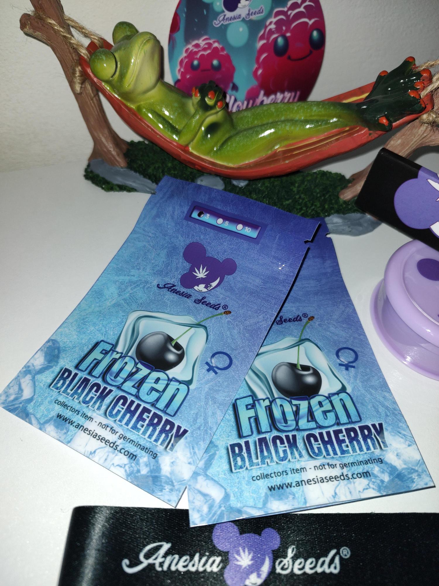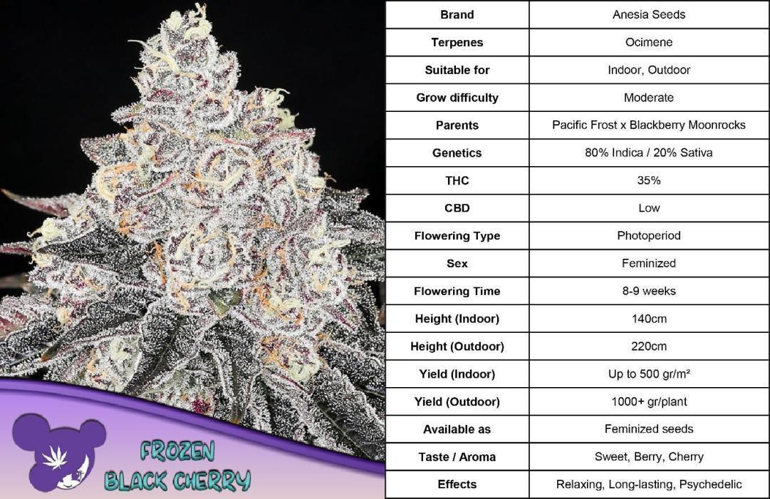 Frozen Black Cherry® is a striking mostly indica hybrid created by crossing Anesia’s Blackberry Moonrocks with Pacific Frost. With a rich cherry aroma and dark frosty buds that look like they’re dipped in snow, this potent cultivar with THC levels up to 35% has eye-candy appeal and enticingly powerful indica heavy effects. She presents a moderately challenging grow, with plants that produce extremely sticky buds that demand meticulous attention throughout her lifecycle. Defoliation is recommended up to three times during veg, and a UVB lamp in the last few weeks of flower will help push the high potency and resin production she was bred for. Flowering is around 56-63 days, where she’ll deliver abundant yields as high as 500g/m2 indoors and 1000g/plant outdoors. Flavor is borderline addictive — blending rich, wild berries with bright sweet cherries and grapes with a subtle sour undertone. The aroma mirrors this combination, for a sensory explosion of sweet fruity goodness. The high begins almost immediately with an unprecedentedly powerful euphoria that’s almost psychedelic with trippy effects and distortion of time. A deeply relaxing body high settles in with this potent head high, making it ideal for listening to music, getting down on creative projects, and chill social gatherings. With her outstanding potency and effects, Frozen Black Cherry® could help medical users alleviate stress, relieve insomnia, help with pain, and reduce anxiety — providing a sweet, relaxing remedy for body and mind.