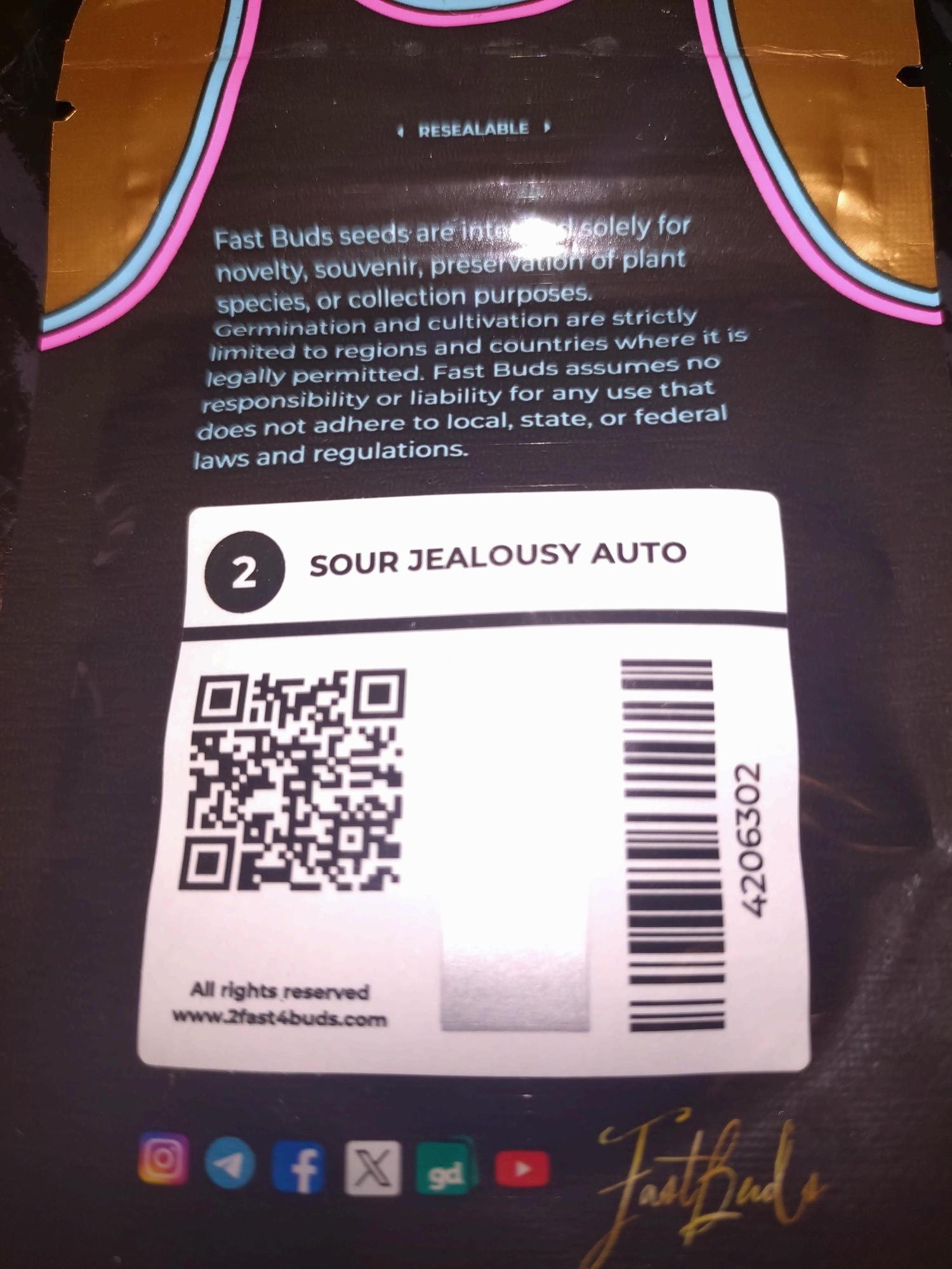 Sour Jealousy Auto™ is a heavily Sativa-dominant hybrid, packing an insane potency with THC levels averaging 29%. This strain was created by Fast Buds from a crossing of Jealousy and Sour Diesel Auto F5. Growers should prepare for a challenging experience. Odor management will be crucial, and you’ll need to provide stable and warm temperatures throughout all growth phases to reach optimal results. Training techniques can come in handy towards the end of flowering, which takes around 60 days to complete. Yields are generous and average around 350g/m². When smoked, Sour Jealousy Auto™ nugs release an earthy and flowery flavor with a sour pungency. The aroma complements this beautifully with similar notes. Despite its Indica-driven genetics, this strain provides a creative and uplifting high with energetic and euphoric effects. The accompanying physical relaxation induces some hunger and sleepiness, but not much sedation. Medical patients hail Sour Jealousy Auto™ for treating chronic stress, depression, and ADHD.